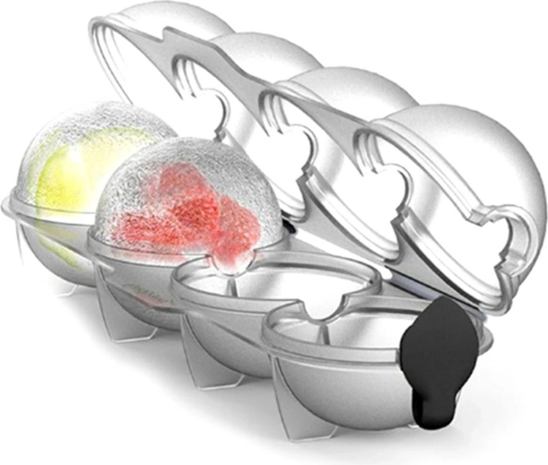 Sæt med 4 gennemsigtige kugler samlet i én form. Ideel til at lave effektfulde is-kugler. Den silikonebaserede ikke-lækende prop gør det lettere at hælde vand over kuglerne og øger lufttætheden under opbevaring i fryseren. Det er det perfekte redskab til køkken og fester, som hjælper dig med at køle og pynte dine drikke.