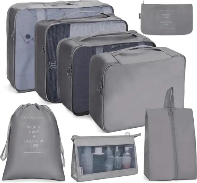 Hold styr på dine ting på rejsen med et 8-delt sæt pakkeposer til kuffert i den alsidige grå farve. Let polyester, praktiske lynlåse, netposer og håndtag for nem transport. Ideel til kosmetik, undertøj, tøj og sko i håndbagagen.