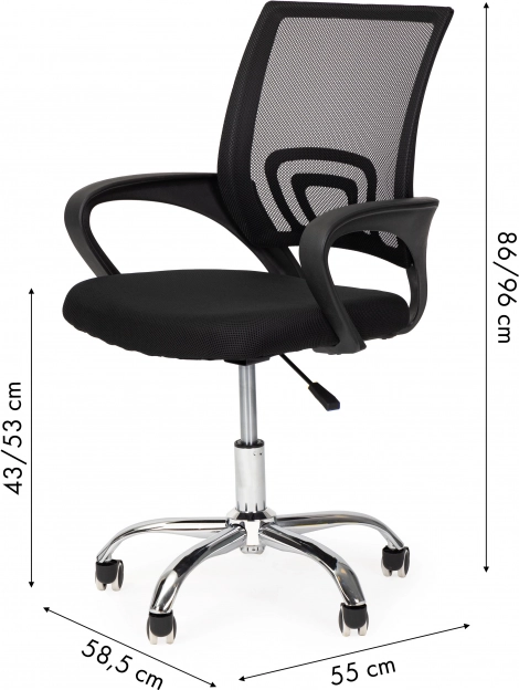Stolen er udstyret med brugervenlige mekanismer til fuld justering, hvilket gør den nem at betjene. Det robuste net i ryglænet sikrer god ventilation, mens den metal- og krombelagte base med fem hjul giver stabilitet og mobilitet.
