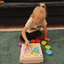 Træpuslespillet hjælper med at udvikle finmotorik, koordination og logisk tænkning. Børn øver også tålmodighed og koncentration, når de laver mønstre.