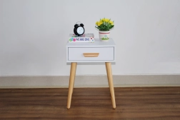 Rene linjer, hvid farve og naturligt træ på benene giver rummet friskhed og lethed. Ideelt som natbord eller sidebord.