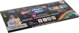 Billedet viser pakken '25 Amazing Magic Changing Pens.' Pakken fremhæver levende farver og den specielle farveskiftende effekt, suppleret med illustrationer og fotos, der viser penne i brug.
