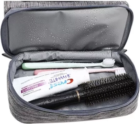 Tasken er fremstillet af materialer, der afviser vand, hvilket er ideelt til brug på badeværelset eller på farten.