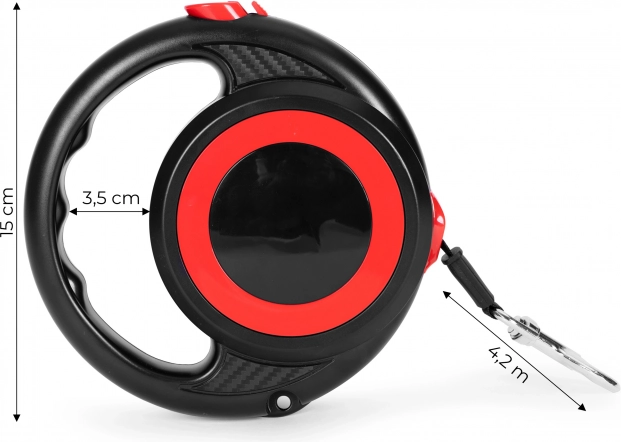 Praktisk selvoprullende line med en længde på 4,2 m til både hunde og katte, som sikrer komfort på gåture og samtidig fuld kontrol over dit kæledyr. Udstyret med pålåselig bremselås, ergonomisk håndtag og drejelig stålkrog, der modvirker at linen snor sig. Robust udførelse fra PETSI.