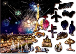 Puslespillet er dobbeltsidet (2-i-1): på den ene side lægger du efter det farverige motiv af Paris om natten med fyrværkeri, på den anden side efter et gentaget mønster udelukkende via brikkernes former. Glatte kanter uden splinter sikres af præcis laserbearbejdning og en solid HDF-plade på 3–4 mm. I æsken finder du også en separat forlæg til mere komfortabel lægning.