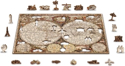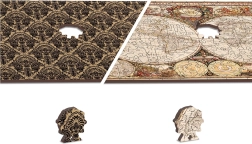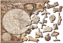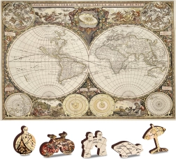 Træpuslespillet med motiv af et antikt verdenskort vil glæde elskere af originale puslespil og samlere af utraditionelle gaver. Takket være dobbeltsidet 2-i-1 udførelse kan du lægge efter billedet på forsiden eller prøve bagsiden med gentaget mønster udelukkende efter brikkernes former.