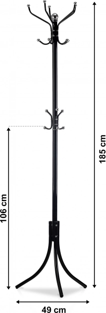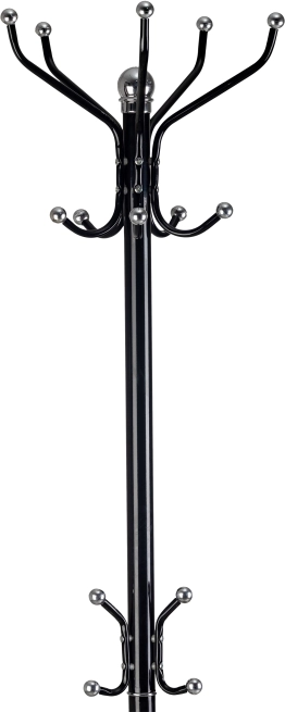 Det stilfulde stativ i tidløs sort er en praktisk løsning til at holde orden i entréen og på kontoret. Den øverste del består af fem arme, hver med to kroge til bekvem ophængning af tøj. I midtersektionen finder du tre mindre knager til håndtasker, tørklæder eller paraplyer. Den solide metalkonstruktion og den stabile tretakkede base giver tryghed i daglig brug.