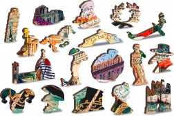 58 specialbrikker formet som dyr, bygninger og genstande. Præcis laser giver skarpe detaljer og glatte, splintfri kanter.