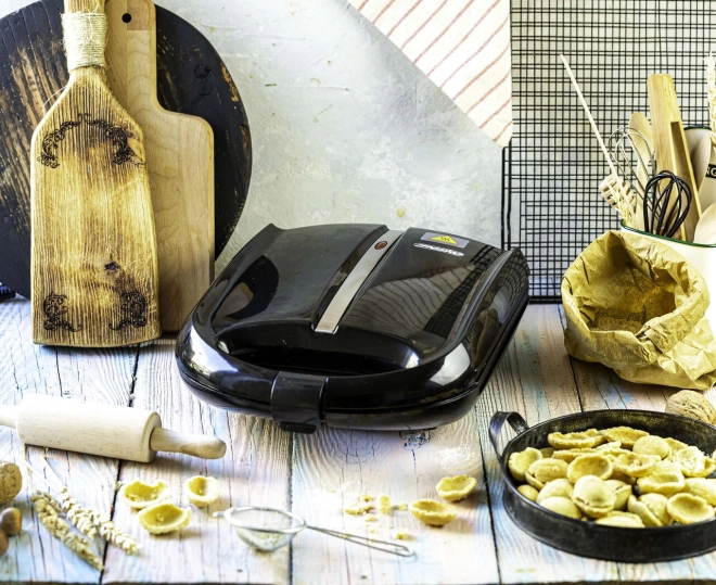 Praktisk udstyr til ethvert køkken: thermoisolerede håndtag, låseclips på låget for sikkert pres, driftsindikator og skridsikre fødder for stabilitet. Takket være høj effekt op til 1600 W kan du bage flere portioner til gæsterne på ingen tid.
