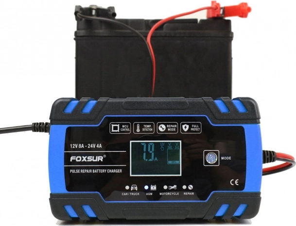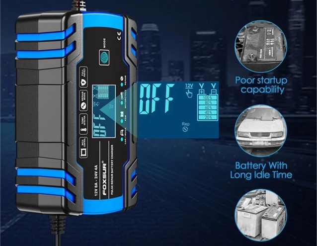 Kompakt og intelligent lader til 12V/24V bilbatterier med digitalt display og reparationsfunktion. Giver hurtig og sikker opladning, tilbyder vinter- og sommertilstand, automatisk beskyttelse og pulserende gendannelse til at genoplive svage batterier. Ideel til biler, motorcykler og andre køretøjsbatterier.