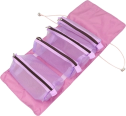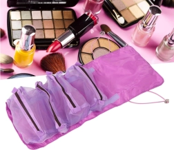 Farvel til kaos i toilettasken. Denne rullelige kosmetikorganizer 4-i-1 tilbyder fire rummelige, gennemsigtige lynlåslommer, som takket være velcro kan tages ud og omarrangeres efter behov. Når den er pakket sammen, strammes den med elastiske stropper og holdes sikkert samlet.