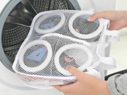 Det tætvævede net og lynlåsen beskytter skoene mod slid og stød og forhindrer samtidig skader på tromlen i vaskemaskinen.