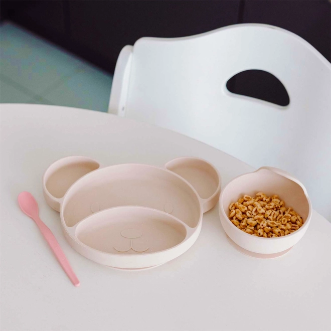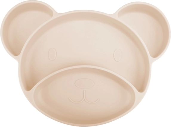 Den praktiske silikone-tallerken med sugekop formet som en bjørn er ideel til de første smagsprøver og BLW-metoden. Takket være de fire rum kan du nemt adskille maden, mens den skridsikre sugekop holder tallerkenen på plads. Den er lavet af 100% fødevaregodkendt silikone, er holdbar og uknuselig, kan tåle opvaskemaskine og varmes i mikrobølgeovn. Fri for BPA, PVC og ftalater.