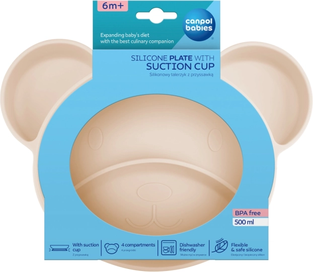 Canpol babies silikone opdelt tallerken Bjørn hjælper børn med at lære at spise selv. Fire rum understøtter en varieret tallerken, adskiller smage og teksturer og motiverer barnet til at prøve nye fødevarer. Den stærke sugekop forhindrer, at tallerkenen vælter eller glider af bordet eller højstolen.