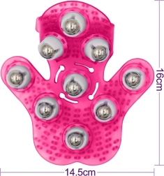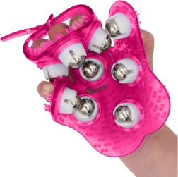 Praktisk massagehandske med 9 metalkugler, der roterer 360° giver øjeblikkelig lindring til trætte muskler og fremmer bedre blodcirkulation. Takket være det ergonomiske design og den justerbare rem ligger den godt i hånden og glider ikke. Velegnet til både tør- og vådmassage, i brusebadet samt med cremer og olier – ideel til nakke, ryg, arme og lår og som hjælp mod cellulite.