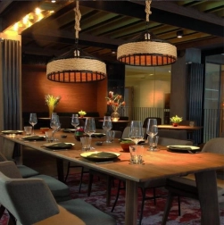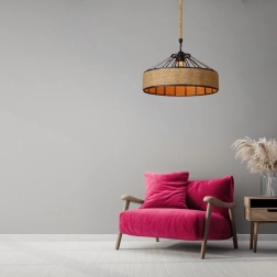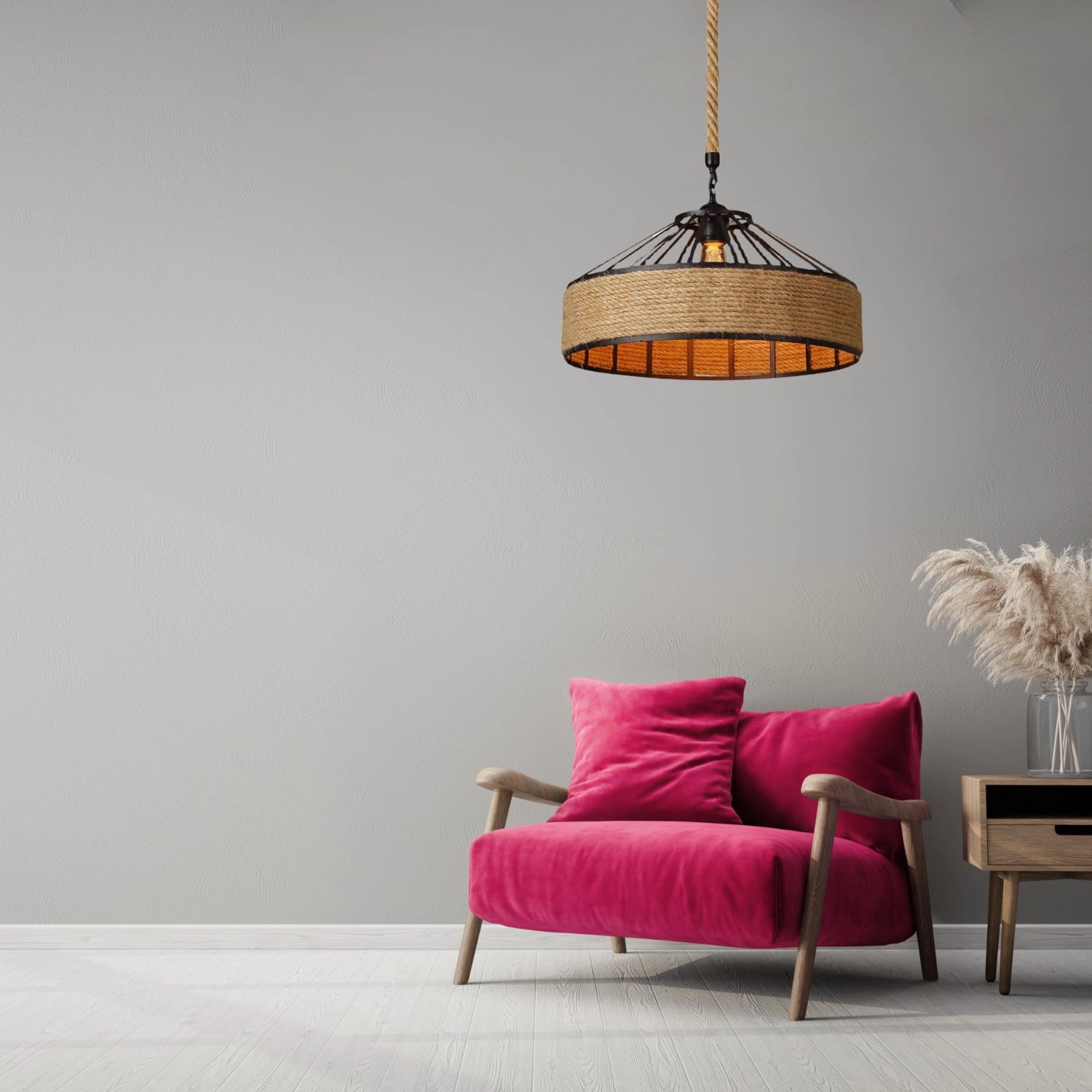 Giv dit hjem et løft med en iøjnefaldende pendel, der kombinerer robust metal og naturligt hampereb. Takket være den originale form og den varme udstråling passer lampen perfekt i stuen, spisestuen eller over køkkenøen. I kommercielle miljøer – fra caféer til boutiquehoteller – skaber den en hyggelig og mindeværdig atmosfære.