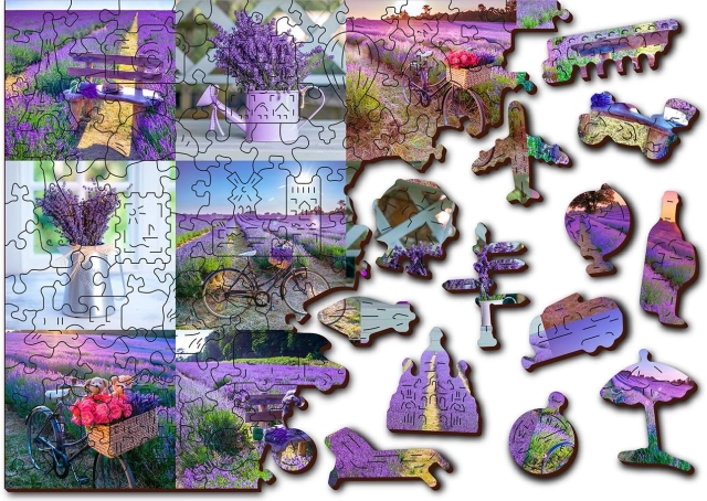 Forkæl dig selv med afslapning med et kvalitets træpuslespil med motiv af lavendelmarker. Den dobbeltsidede 2-i-1 udførelse gør det muligt at lægge både efter det farverige billede og efter bagsiden med gentaget mønster – ideelt for dem, der elsker gennemtænkte udfordringer og præcis udførelse.