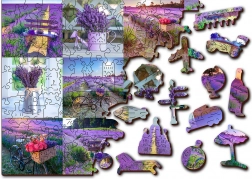 Puslespillet er dobbeltsidet og kan samles efter lavendelmotivet eller mønsteret på bagsiden.