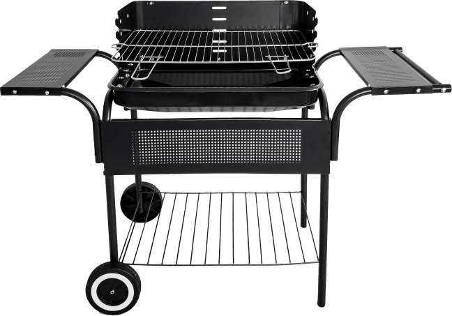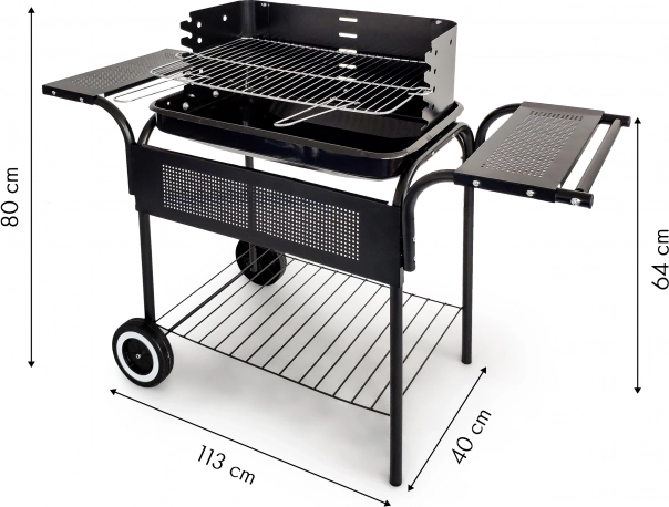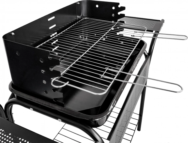Funktionelle hylder giver rigelig plads til opbevaring af nødvendige ting som trækul, optændingsblokke og tallerkener med de retter, der er ved at blive forberedt. Den nederste store hylde er ideel til opbevaring af større genstande.