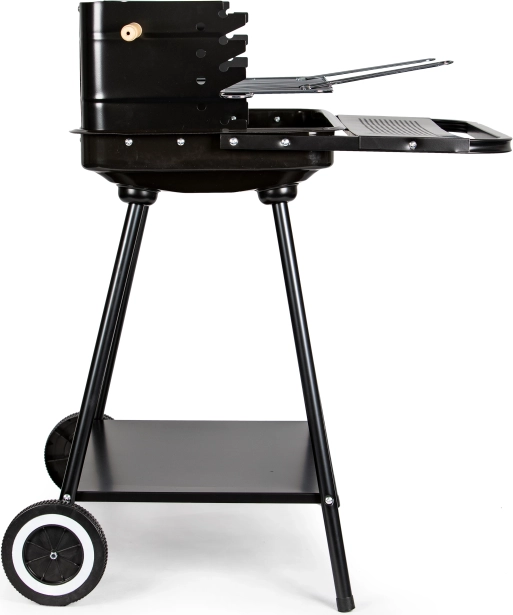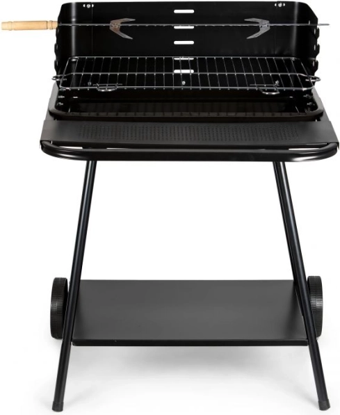 Dette grill er udstyret med hjul og håndtag, som gør det nemt at flytte selv i fuldt opvarmet tilstand. Den nederste hylde giver plads til opbevaring af kul eller andet grilludstyr.