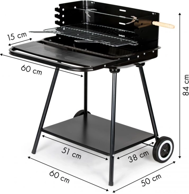 Grill MultiGarden er designet til dem, der værdsætter funktionalitet og komfort. Stor forkromet grillflade med dimensionerne 53x34 cm gør det muligt at tilberede flere retter på én gang, ideel til familiefester og venlige sammenkomster. Takket være den justerbare højde kan du grille mad efter dine egne behov. To funktionelle hylder giver rigelig opbevaringsplads til alt nødvendigt grilludstyr.
