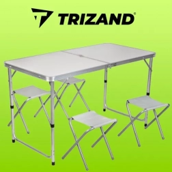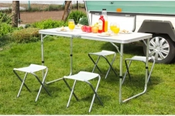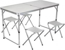 Dette alsidige campingsæt kombinerer et stabilt bord med justerbar højde og fire holdbare, sammenklappelige skamler. Takket være kuffertsystemet er hele sættet nemt at bære og opbevare – det sammenfoldede bord rummer alle skamler indeni, og sikkerhedslåse forhindrer, at det åbner under transport.