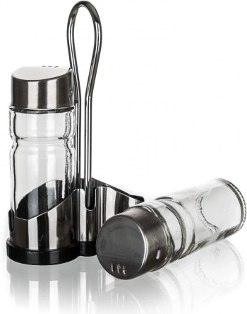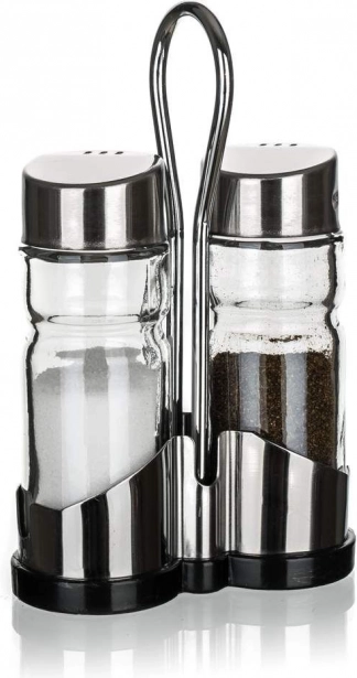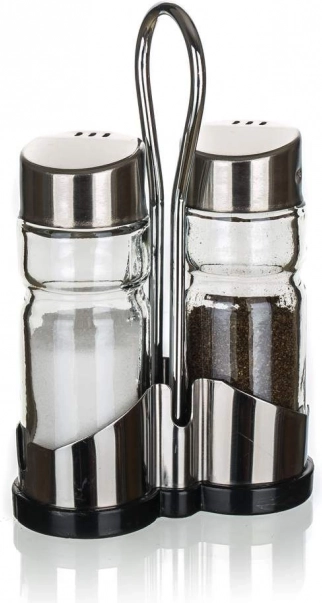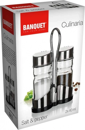 Banquet-sættet til salt og peber indeholder to glasbeholdere med en kapacitet på 40 ml, som er placeret i et metalstativ. Kombinationen af glasdåser med sølvfarvede låg giver stil til dit bord og sikrer samtidig nem krydring af maden.
