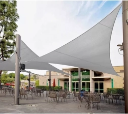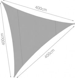 Den trekantede form 4 × 4 × 4 m skaber behagelig skygge over siddeområdet på terrasse eller i have. Materialet reducerer overophedning og tillader luftcirkulation.