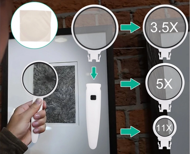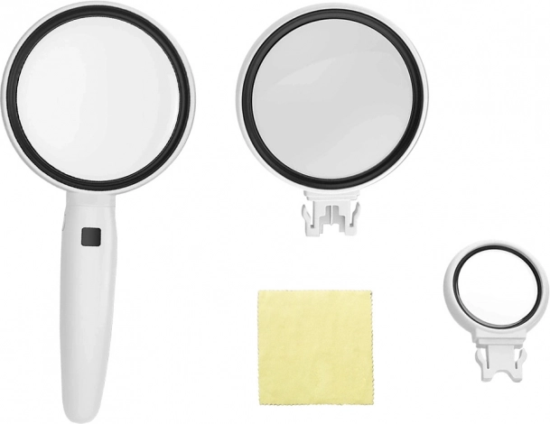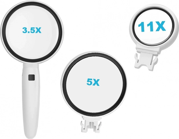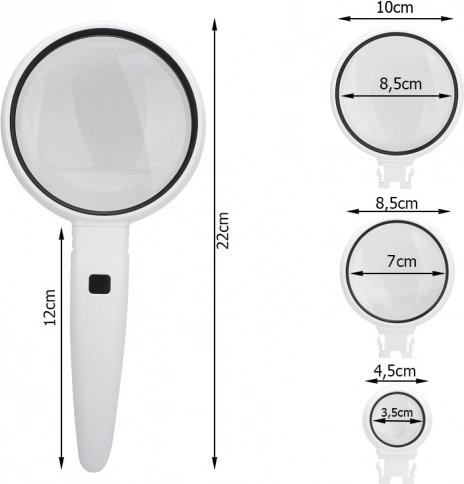 Praktisk håndholdt lup med ergonomisk håndtag og 2x LED-belysning for et klart og behageligt blik på detaljer. I pakken finder du 3 udskiftelige linser med forstørrelse 3,5x, 5x og 11x, ideel til læsning, numismatik, smykker samt præcist hobbyarbejde. Strømforsynes af 3× LR44-batterier (inkluderet).