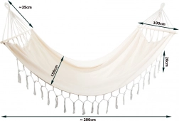 Denne boho-hængekøje er ideel til både par og singler, der elsker komfort og stil. Den brede liggeflade med spredestænger holder stoffet pænt udstrakt, så du kan ligge behageligt og nyde roen i haven, på altanen eller på ferien.