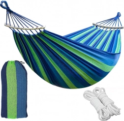 Denne hængekøje er skabt med fokus på maksimal komfort og holdbarhed. Den er lavet af slidstærk bomuld med polyesterblanding, hvilket sikrer en stabil og åndbar konstruktion. Ideel til læsning, afslapning eller blid gyngen i naturen.