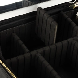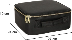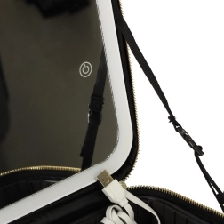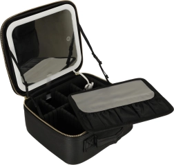 Den elegante sorte kosmetikkuffert holder dit udstyr perfekt organiseret både hjemme og på rejse. Indvendigt finder du justerbare rumdelere, en lomme til børster eller læbestifter og slidstærk polstring, der beskytter indholdet. Det indbyggede LED-spejl med tre lysindstillinger og touchsensor sikrer præcis makeup overalt.