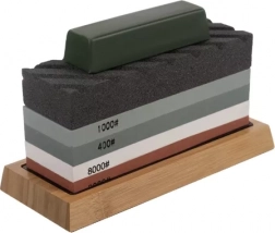 Skridsikre måtter og den tunge bambusbase holder stenen fast på plads. Slibningen er sikker og præcis selv under længere arbejde.