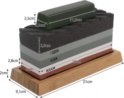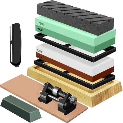 Med dette professionelle RUHHY-vandstenssæt opnår du nemt en barberbladsskarp æg. Kombinationen af kornstørrelser 400/1000/3000/8000 dækker hele processen fra hurtig materialefjernelse til spejlblank polering. Skridsikre måtter og bambusbase sikrer stabilitet, føringer holder den korrekte slibevinkel, og læderremmen med pasta giver klingen den endelige glans.