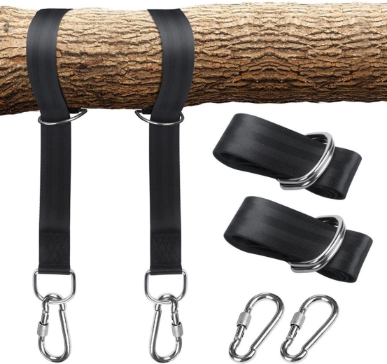 To stærke stropper beregnet til ophængning af en hængekøje eller gynge med stålspænder og to ekstra karabinhager. En maksimal belastning på op til 150 kg sikrer sikker brug.