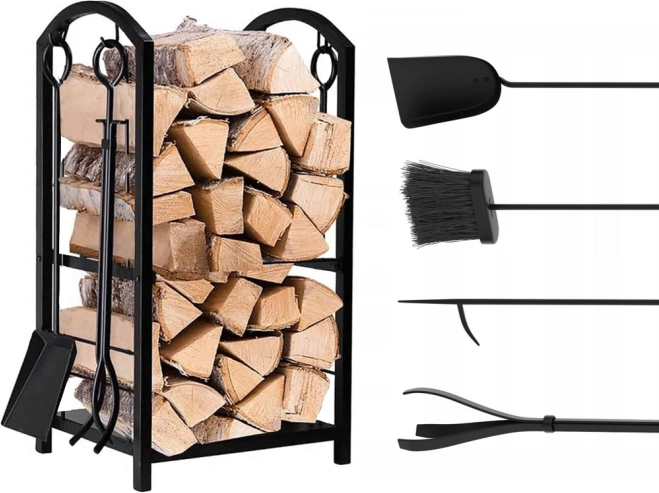 Stander til brænde lavet af kvalitetsstål tilbyder elegant og funktionel løsning til opbevaring af træ og pejsesager. Takket være sit enkle og æstetiske design passer det ind i ethvert interiør.