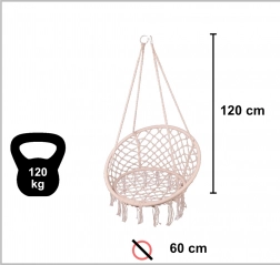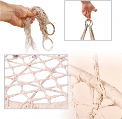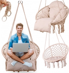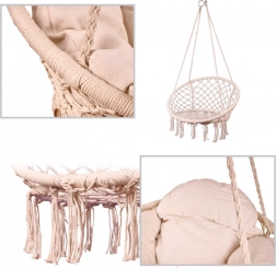 Denne hængestol giver en komfortabel siddeoplevelse til både afslapning og blid gyngen. Den store runde form og den bløde pude understøtter en ergonomisk kropsstilling, mens stærke bomuldsreb og metalramme giver tryghed og lang levetid.