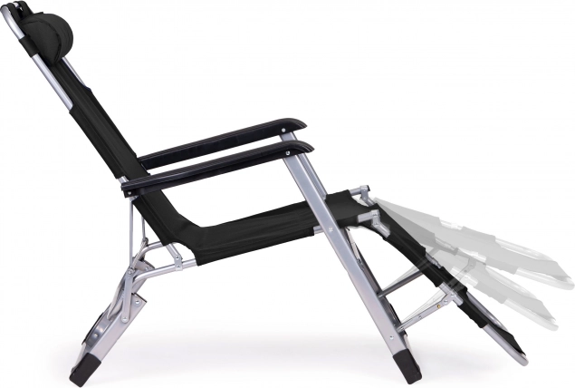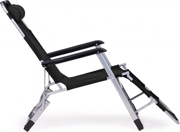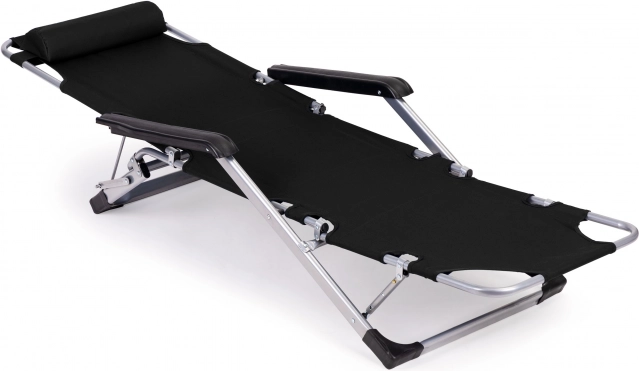Metalramme, skridsikre endestykker og fodstøtte med 3 positioner for sikker komfort. Liggestolen kan hurtigt foldes og bæres.