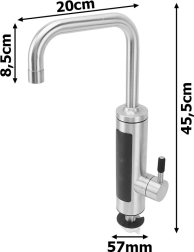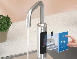 Den elektriske gennemstrømningsvandvarmer er integreret direkte i køkkenarmaturet og giver komfort, pladsbesparelse og øjeblikkelig opvarmning. Takket være 3000 W effekt får du varmt vand på få sekunder, uden ventetid og uden behov for central opvarmning. Det integrerede LCD-display viser temperaturen tydeligt, så du har fuld kontrol over komfort og sikkerhed.