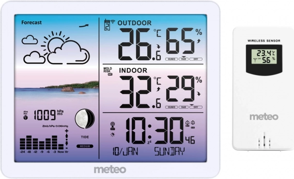 Vejrstationen viser vejrpiktogrammer, Månens faser og et komfortindeks, så du straks ved, hvilke forhold der hersker, og hvad du kan forvente i de næste timer.