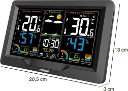 Meteo hjemme vejrstation er en højtudstyret enhed til overvågning af vejret. Tilbyder trådløs måling af temperatur og fugtighed. Forudsiger vejret ved hjælp af ikoner og tilbyder en behagelig komfortindikator.