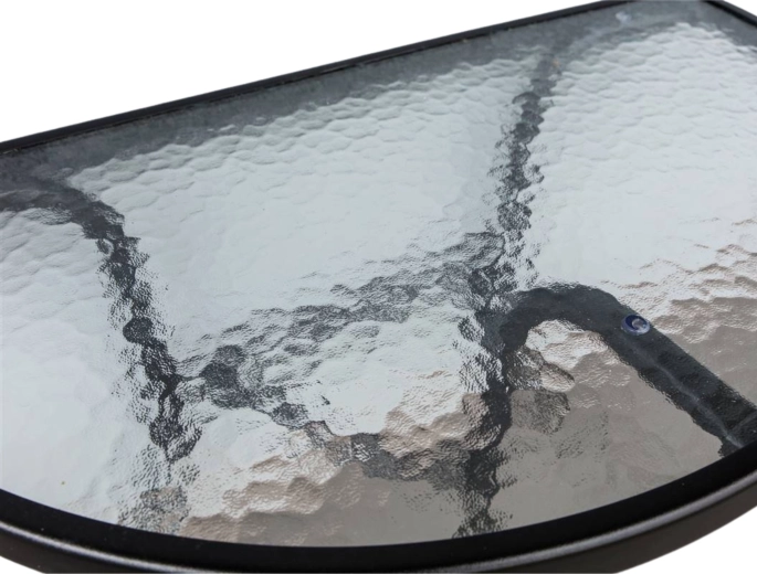 Den stabile bordplade i hærdet glas er ridsefast og let at rengøre. Halvmåneformen sparer værdifuld plads på altanen.