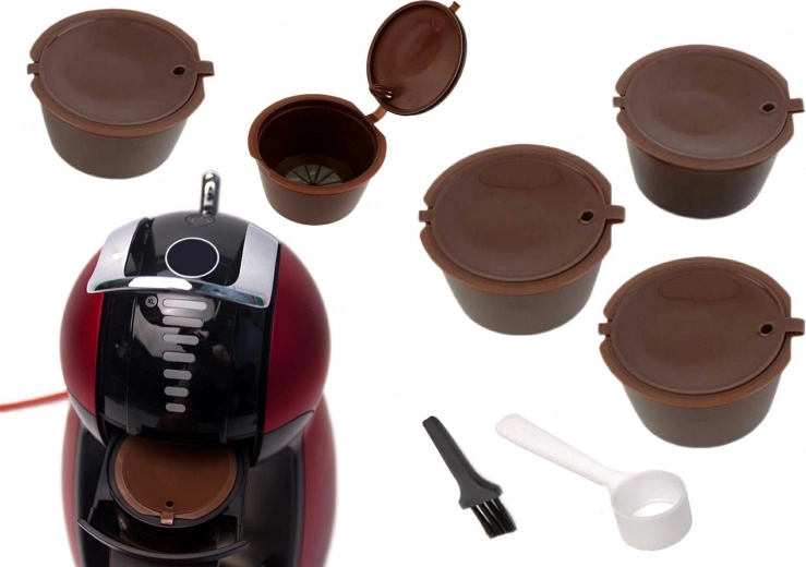 Sæt med 5 genanvendelige kapsler til tilberedning af kaffe og te. Hver kapsel kan brygge kaffe op til 80 gange takket være det genanvendelige stålfilter. Du behøver ikke hele tiden at købe nye, dyre kapsler! Særdeles nemme at bruge (fyld kapslen med kaffe, luk låget, og sæt den i kaffemaskinen med åbningen indad). Kompatible med Dolce Gusto-kaffemaskiner. Måleske til kaffe og rengøringsbørste medfølger i pakken.
