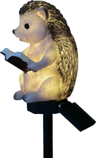 En usædvanlig solcelledrevet LED havelampe i form af et pindsvin, der læser en bog. Et perfekt dekorativt element. Lampen drives af solenergi, som via et solpanel oplader det indbyggede genopladelige batteri. Enheden tænder automatisk, når det bliver mørkt (udstyret med skumringssensor), og en fuld opladning rækker op til 8 timers uafbrudt drift. Lampen er udstyret med en LED, der udsender varmt hvidt lys. Den stærke jordspids gør det muligt at fastgøre lampen sikkert og hurtigt i jorden, mens det vandtætte kabinet sikrer problemfri brug uanset vejrforholdene.