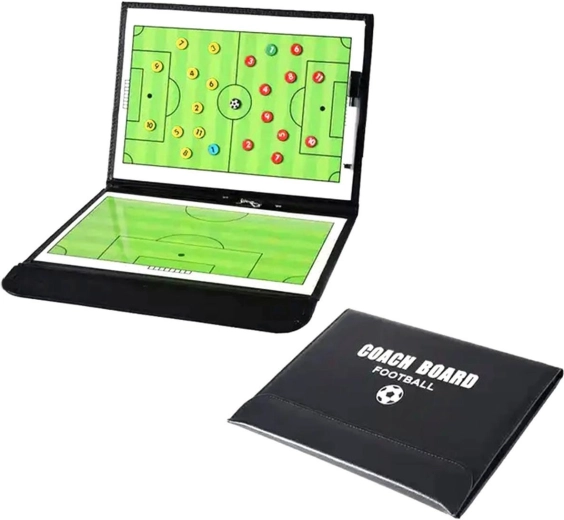 Taktisk tavle til fodboldtræning. Praktisk mappeform med lukning med velcro i økolæder. Udstyret med to magnetiske tavler med afbildning af banen. Sættet indeholder også en tør-slet tusch og 24 magneter. Tavlerne er lavet af vandafvisende materiale, som muliggør træning selv under vanskelige vejrforhold. En ekstra krog gør det muligt at hænge tavlen op.