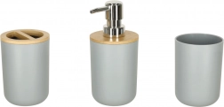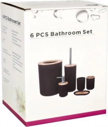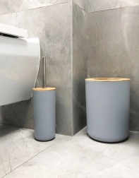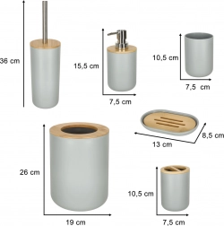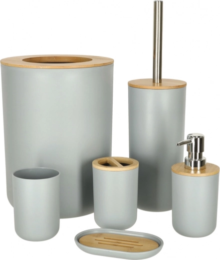 Stilfuldt 6-delt badeværelsessæt i elegant grå med naturlige træaccenter samler udtrykket i dit badeværelse og tilbyder alt, hvad du behøver til den daglige hygiejne. Indeholder sæbedispenser, tandbørstekop, holder til tandbørster, sæbeskål, toiletbørste med holder og affaldsspand. Det robuste plastmateriale og nem vedligeholdelse sikrer lang levetid og et moderne, minimalistisk look.