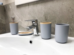 Hvert element er designet til daglig komfort – sæbeskålen med bambusindsats holder sæben tør, dispenseren doserer flydende sæbe præcist, organisatoren til tandbørster og koppen holder orden ved håndvasken, mens toiletsættet og spanden sikrer renhed i hele badeværelset.