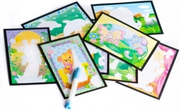 Fremgangsmåde: Åbn den magiske pen, fyld den med vand og luk den. Strøg over de relevante dele af billederne, indtil de bliver farvede. For mindre børn kan man også bruge en almindelig pensel og et bæger med vand.