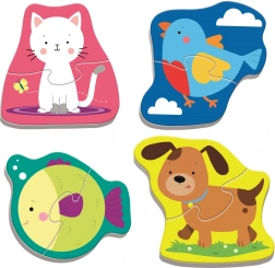 Et farverigt sæt TREFL BABY puslespil med motiver af husdyr, som glæder de allermindste fra 1 år. Indeholder 4 enkle mini-puslespil (kat, hund, fisk, fugl) lavet af solid, sikker pap. De store brikker passer perfekt i små hænder og understøtter finmotorik, logisk tænkning og læring af dyrenes navne. Den praktiske transportæske med hank er velegnet både hjemme og på farten.