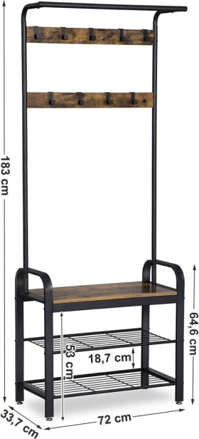 Dette alsidige entrémøbel hjælper med at tæmme frakker, jakker og accessories og tilbyder samtidig en komfortabel plads til at tage sko på. Takket være den robuste stålkonstruktion og træhylder i rustikt look får du et holdbart og stilfuldt møbel, der passer perfekt til både moderne og industrielle interiører.